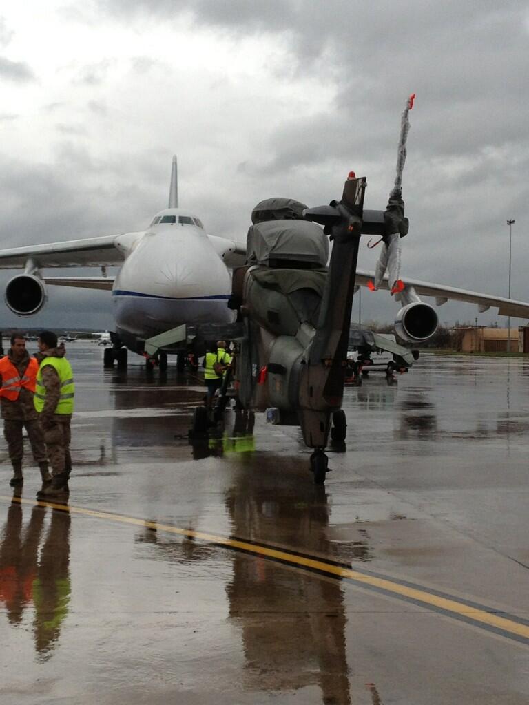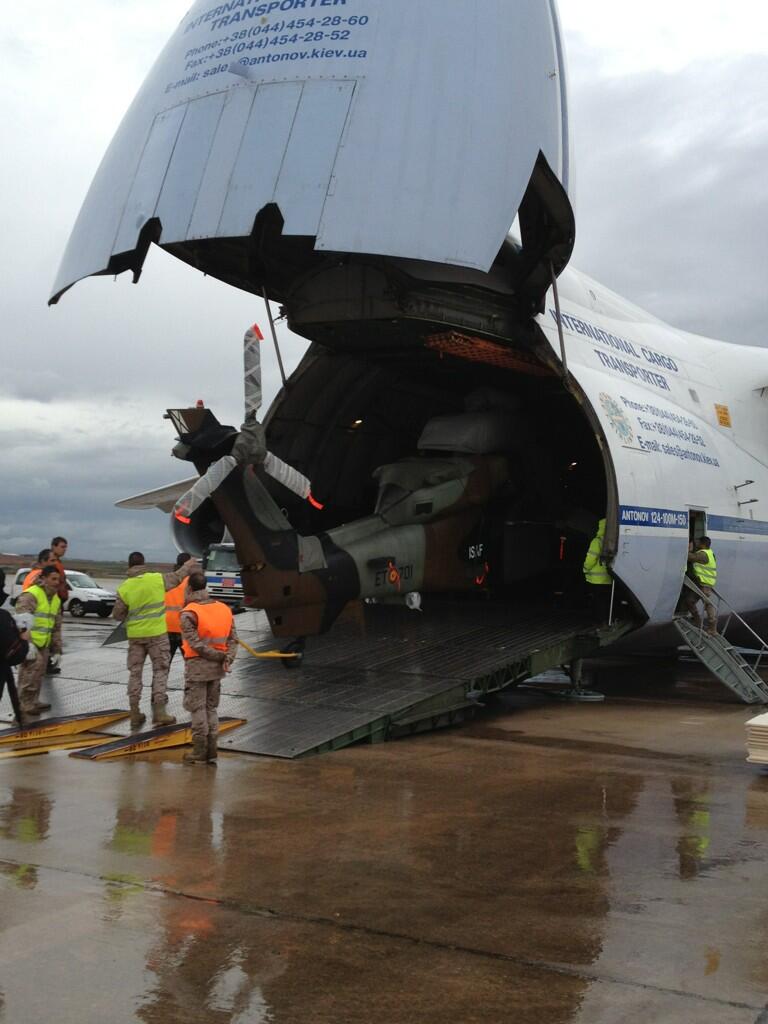 En la tarde del pasado día 26 de marzo, los tres helicópteros fueron embarcados en un avión Antonov AN-124 de la compañía Ruslan International, fletado por el Ministerio de Defensa. Este avión tiene capacidad, para trasladar en un solo viaje, los tres aparatos.